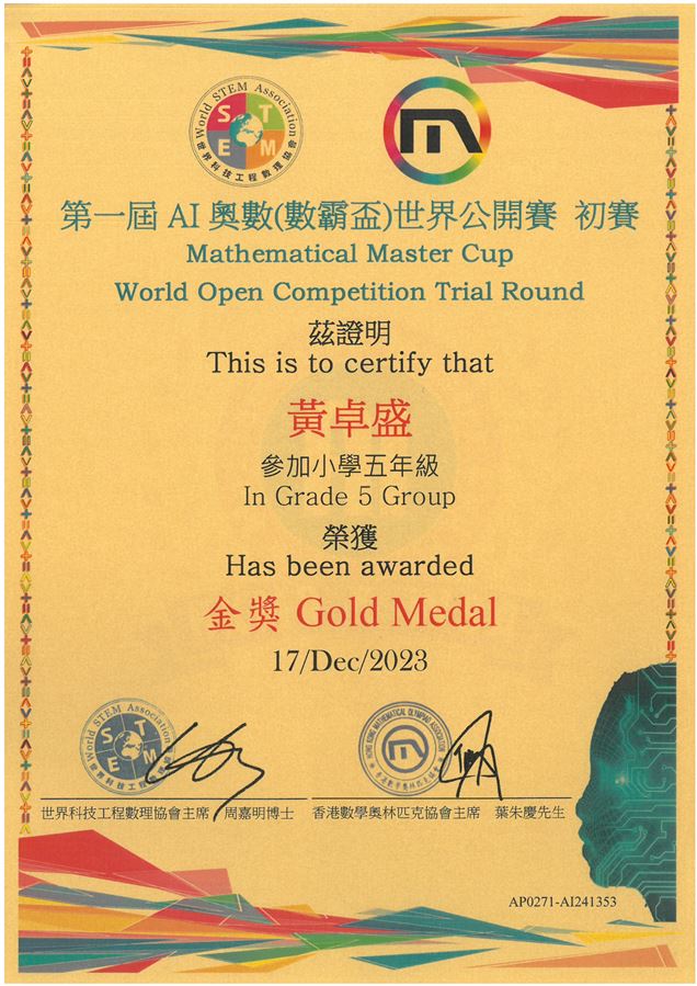 恭賀本校5A黃卓盛榮獲第一屆AI奧數(數霸盃)世界公開賽初賽 金奬,同時本校亦獲得是項比賽團體 亞軍。