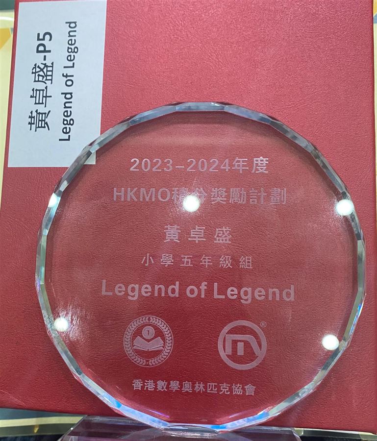 恭喜6A黃卓盛於香港數學奧林匹克協會 2023–2024年度《Legend、 Legend of Legend》積分奬勵計劃中獲得五年級legend of legend 獎項