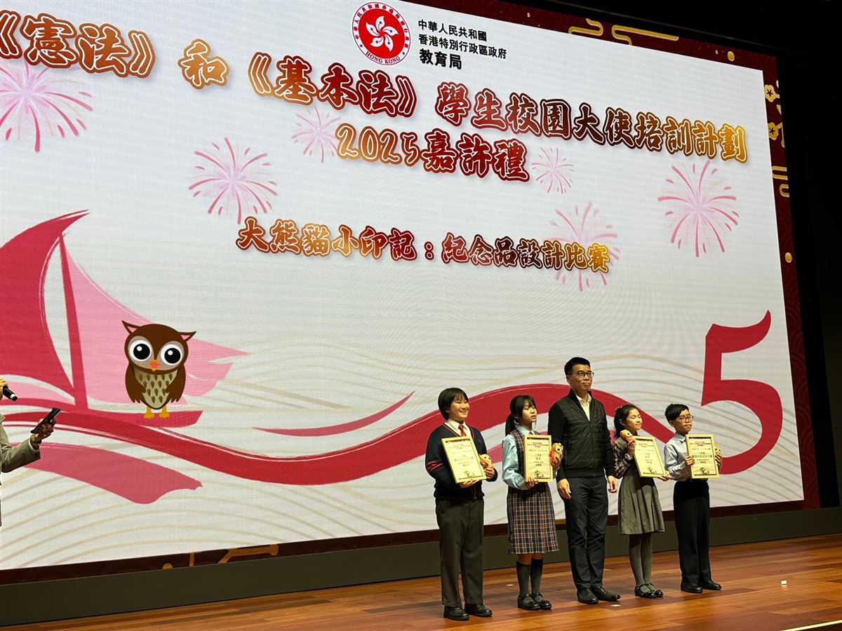 由教育局課程發展處舉辦的《憲法》和《基本法》學生校園大使培訓計劃(大使計劃)「大熊貓小印記:紀念品設計比賽」、本校學生5B李承弢取得「大熊貓小印記:紀念品設計比賽最具大熊貓魅力獎」。
