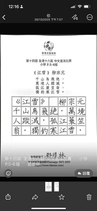 為提高同學對書法的興趣,本校特意派出同學參與由通善壇舉辦的「2025 年全港青少年書畫比賽」。其中,4D蔡昊成、6A彭楷軒獲得硬筆組優異獎;而6D鄧煜林獲得了毛筆組優異獎,實在可喜可賀!